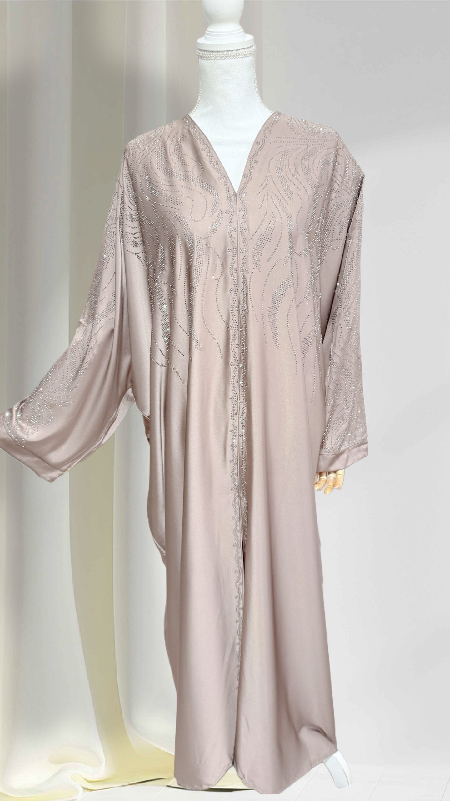Abaya kimono couleur taupe, légèrement évasée sur le bas. Modèle Farasha (papillon) avec de nombreux détails en strass sur l’ensemble du kimono.